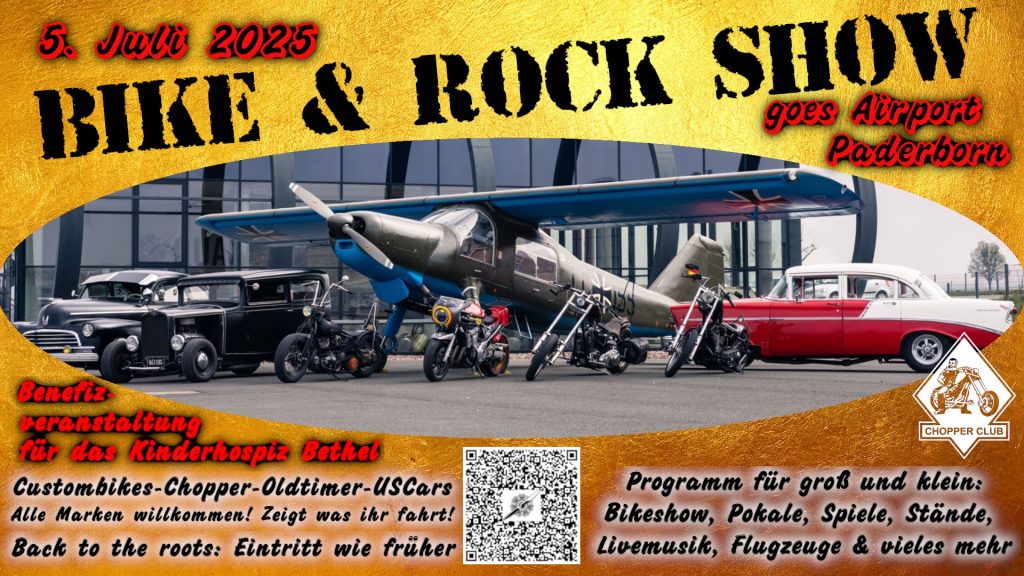 Am 5. Juli 2025 fand zum 22. Mal die Bike & Rock Show des CHOPPER CLUB GERMANY statt und wir hattenen tolle Nachrichten: Der Flughafen Paderborn öffnete seine Tore für uns mit ein paar ganz besonderer Attraktionen.